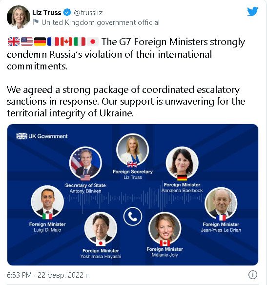 Эти же слова российские дипломаты могли бы использовать в отношении участников многосторонних форматов, собравшихся — онлайн или очно — во вторник. Так, та же Лиз Трасс написала вечером в Twitter: «Главы МИДов стран G7 строго осуждают несоблюдение Россией своих международных обязательств. Мы согласовали пакет жестких скоординированных санкций в ответ». Подробностей она не привела.