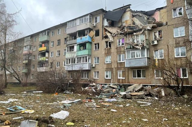 «На четвертом этаже разрушение внутренних перегородок двух квартир, на третьем этаже перекос стен, выбиты окна, второй этаж — выбиты окна», — сообщает МЧС.