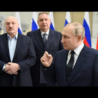 12 апреля 2022. Президент РФ Владимир Путин во время встречи с работниками космодрома Восточный в сборочном цехе ракеты-носителя. На втором плане: президент Белоруссии Александр Лукашенко и генеральный директор государственной корпорации «Роскосмос» Дмитрий Рогозин.