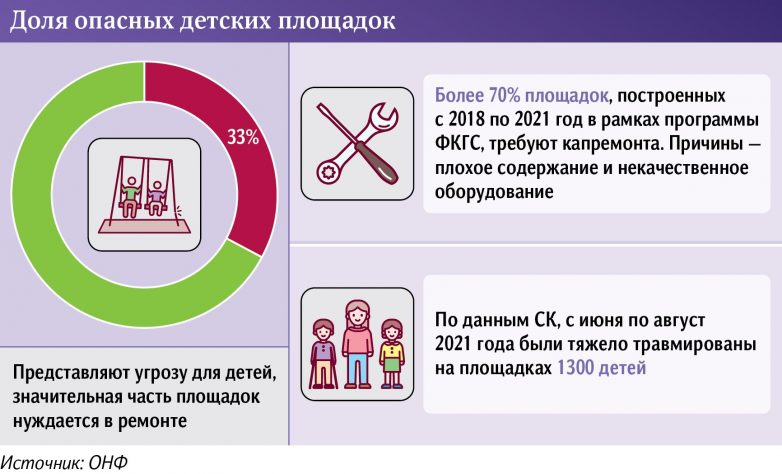 Как выяснили «Известия», глава исполкома ОНФ Михаил Кузнецов накануне Дня защиты детей направил обращения в адрес руководителей Минстроя, Генпрокуратуры и Роспотребнадзора. В них он обращает внимание на состояние детских площадок, «Народный фронт» мониторит их ежегодно.«В рамках акции «Безопасный двор» осенью 2021 года было проверено 2,1 тыс. детских и спортивных объектов в 572 городах. Так, 696 (33%) объектов были признаны опасными: 470 детских и 226 спортивных площадок. Активисты неоднократно столкнулись с нарушениями установленных ГОСТов», — говорится в документах.