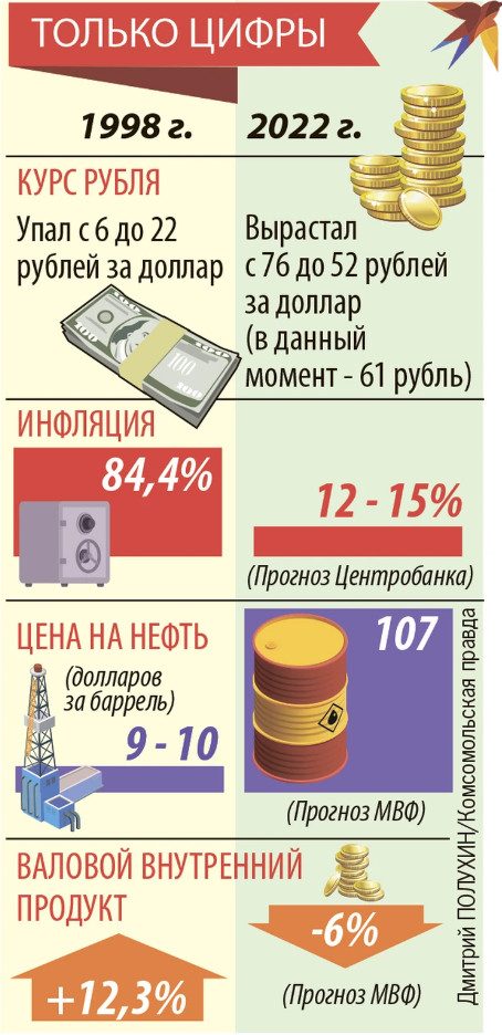 От августа россияне традиционно ничего хорошего не ждут: в 91-м году, например, случился путч. В 2010-м — небывалые лесные пожары. А многие до сих пор с содроганием вспоминают август 1998-го, когда случился дефолт. Сбережения россиян обесценились, упал рубль, цены взлетели, люди беднели на глазах, многие теряли работу… Действительно ли нынешний и тот кризисы похожи? А чем отличаются? И главное — чего нам ждать дальше?