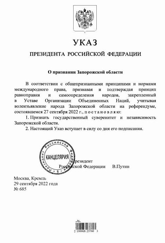 Во втором аналогичном указе говорится о признании суверенитета и независимости Запорожской области.