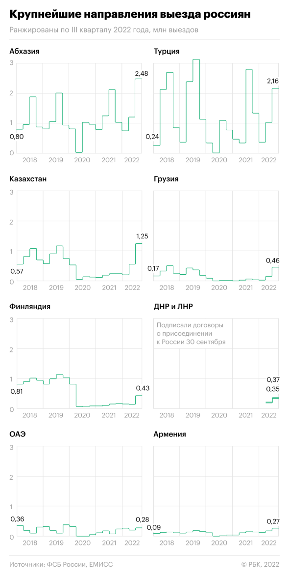 По статистике ФСБ, за июль—сентябрь в Грузию выехали чуть более 461 тыс. раз. Это самое большое число с третьего квартала 2018 года, когда границу с Грузией пересекли почти 514 тыс. раз. Рост выездов в июле—сентябре по сравнению с аналогичным периодом 2021 года составил 605%, а если сравнивать с допандемийным 2019 годом — 24%. С начала 2022 года число выездов в Грузию росло — с января по март туда приехали 38 тыс. раз, с апреля по июнь — 163 тыс.Национальная администрация туризма при правительстве Грузии сообщала, что число россиян, приехавших в страну, только в июне выросло на 503% по сравнению с 2021 годом и составило 90 тыс. человек.