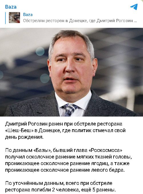 По информации Telegram-канала Baza, во время обстрела Рогозин праздновал день рождения в ресторане «Шеш-Беш», расположенном под гостиницей. 21 декабря ему исполнилось 59 лет. «Бывший глава «Роскосмоса» получил осколочное ранение мягких тканей головы, проникающее осколочное ранение ягодиц, а также проникающее осколочное ранение левого бедра», — написал канал.