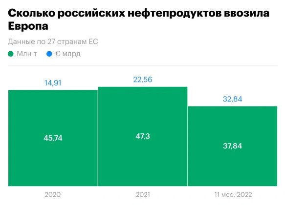 Вступило в силу эмбарго на поставки российских нефтепродуктов (бензина, дизеля, керосина, нафты и мазута) в Евросоюз, на который приходилось 42% от общего экспорта этого сырья из России. Исторически они занимали примерно столько же — около 40% — импорта в ЕС.