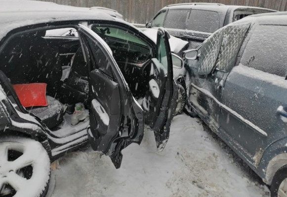 Первые столкновения произошли сегодня, 26 февраля, примерно в 11:20. На 17:00 в массовое ДТП попало 35 легковых и семь грузовых автомобилей. Непогода и плохая видимость способствуют тому, что подъезжающие к ДТП машины не могут затормозить.