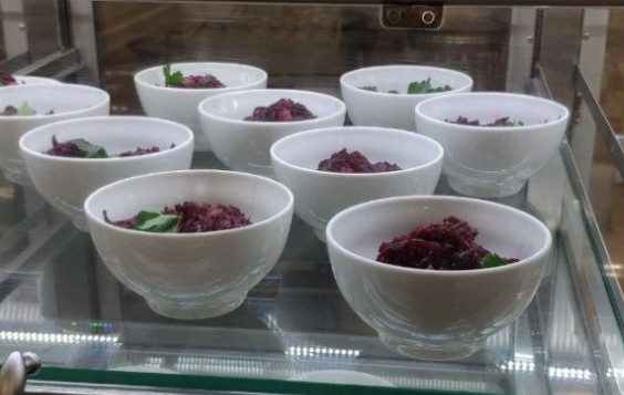 На закуску депутатам предлагают фаршированное яйцо за 75 рублей, салат с крабовыми палочками и морской капустой (85 рублей). Самый дешевый салат — из свеклы с маринованными огурцами (42 рубля) — можно закусить соленым салом за 50 рублей.Порции не слишком большие, салаты по 100 граммов, закуска — 70.