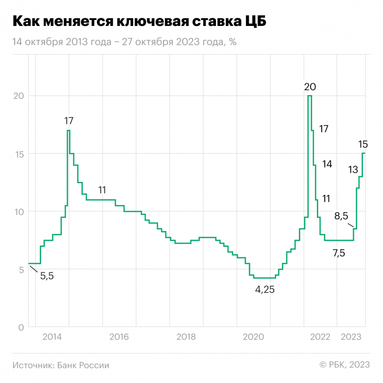 Банк России начал ужесточать денежно-кредитную политику в июле, с тех пор прошло уже четыре раунда повышения ставки, показатель вырос вдвое — с 7,5 до 15%. При этом среднесрочный прогноз ЦБ допускает еще один подъем ставки до конца года.