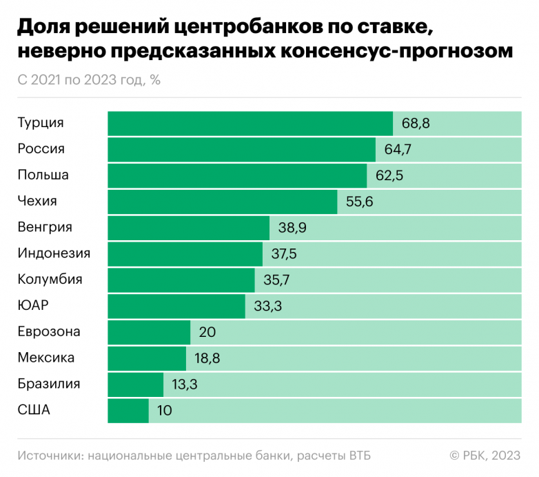 «Видя на примере 2023 года, как часто и насколько существенно Банк России пересматривает свои прогнозы внутри года, мы стали считать практику публикации прогнозного диапазона ключевой ставки даже вредной: этот инструмент превратился в «ложного друга аналитика». Нравится это кому-то или нет, но объективно ЦБ является одним из самых непредсказуемых центральных банков мира в части денежно-кредитной политики: об этом говорило исследование МВФ 2018 года (.pdf), охватывающее период 2010–2018 годов», — отметил Пьянов. Речь идет о расхождении прогнозов аналитиков по решению на том или ином заседании по сравнению с фактическими решениями регуляторов.