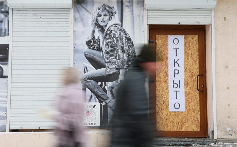 Люди у обитой плитами ОСБ витрины магазина, поврежденного в результате обстрела Донецка (Фото: Дмитрий Ягодкин / ТАСС)