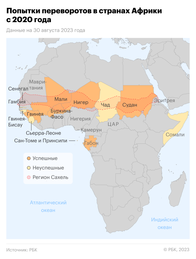 Руководства этих стран, часто являющиеся военными хунтами, все чаще дистанцируются от своих традиционных союзников среди западных стран и сближаются с Россией. Смена курса происходит на фоне волны террора и нестабильности в регионе. Военные захватили власть в Нигере, Буркина-Фасо и Мали из-за роста недовольства неспособностью гражданских правительств обуздать проблему исламистских повстанцев, связанных с ИГИЛ и «Аль-Каидой» (обе организации признаны террористическими и запрещены в России).