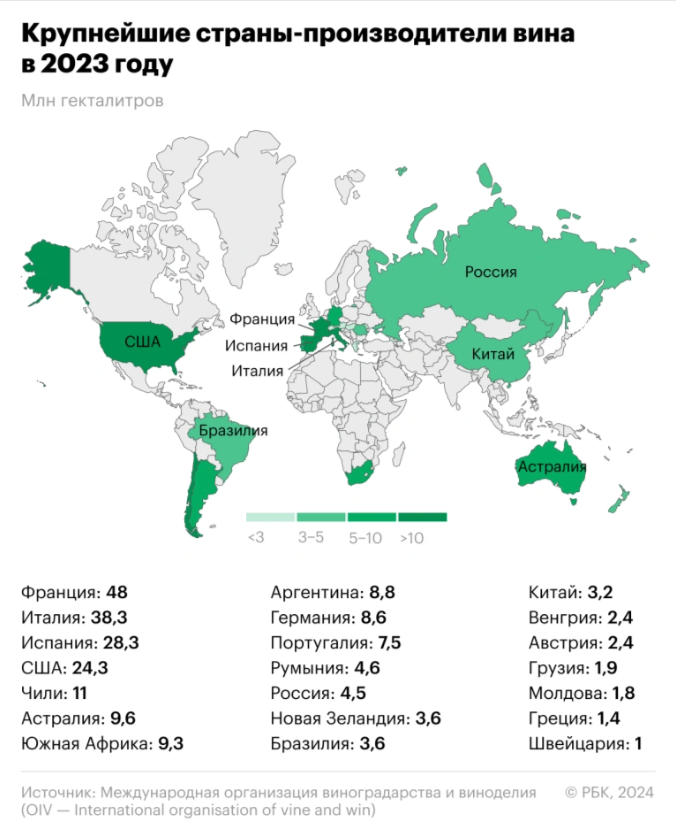 По объему потребления вина Россия занимает седьмое место в мире после США, Франции, Италии, Германии, Великобритании и Испании с долей 3,9%. Общее мировое потребление в 2023 году оценивается в 221 млн гл.