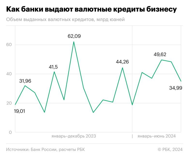 В июне объем выдач корпоративных кредитов в валюте упал на 27,6%, до 34,99 млрд юаней, подсчитал РБК. Банки могли сжать валютное кредитование из-за ухудшения ситуации с юаневой ликвидностью, говорят эксперты